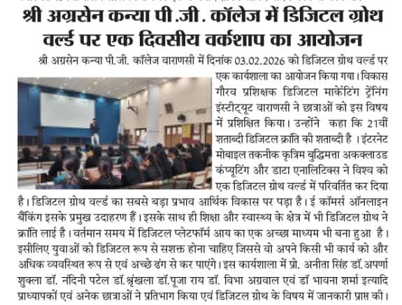श्री अग्रसेन कन्या पी.जी. कॉलेज, वाराणसी में दिनांक 03 फ़रवरी 2026 को “डिजिटल ग्रोथ वर्ल्ड” विषय पर एक दिवसीय कार्यशाला का आयोजन किया गया। इस कार्यशाला का उद्देश्य छात्राओं को डिजिटल युग की बदलती तकनीकों, डिजिटल मार्केटिंग एवं ऑनलाइन व्यवसाय की संभावनाओं से अवगत कराना था।